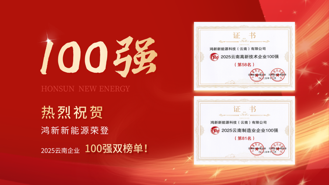 近日,以“助力云南企业高质量发展 领航云企协同新征程”为主题的2025云南企业100强发布会在昆明隆重举行。会上,云南省企业联合会、云南省企业家协会正式揭晓系列权威榜单,华民股份控股子公司鸿新新能源凭借先进的制造实力、突出的创新能力及卓越的产业贡献,荣登“2025云南制造业企业100强”与“2025云南高新技术企业100强”双榜单。